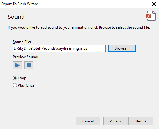 You can save your animations in SWF Format, this enables you to add sound to your animation. This feature is available in Professional version only.