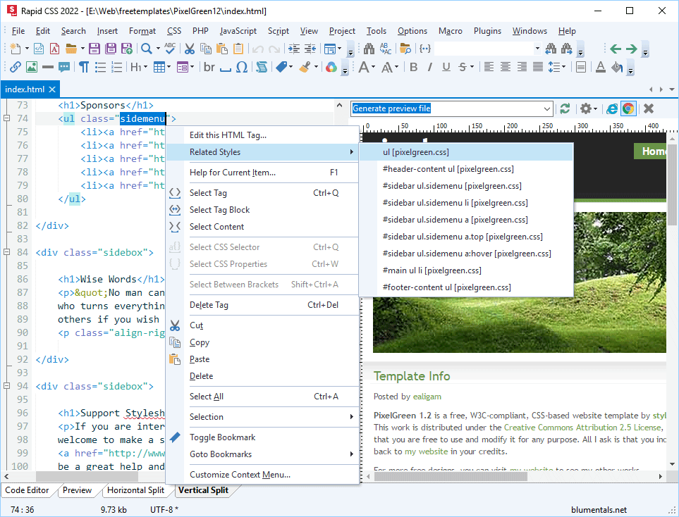 Rapid CSS ist ein vollständiger HTML- und XHTML-Editor mit allen wichtigen Funktionen wie HTML-Auto-Vervollständigen, Inspektor und integrierter Dokumentation.